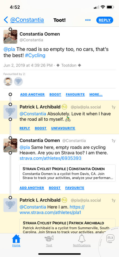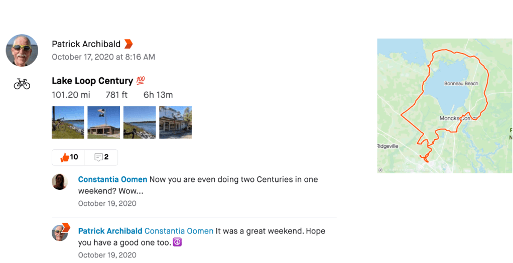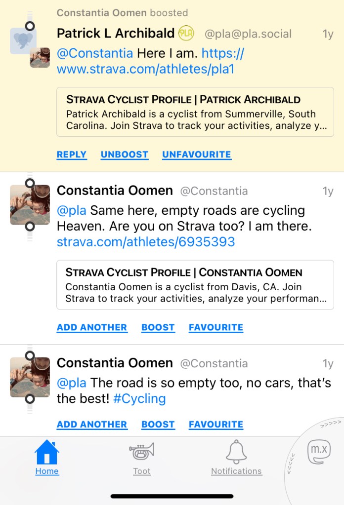 De volgende galerij start met onze ontmoeting op Mastodon, en gaat dan van je meest recente posts naar het begin van 2020, en eindigt met het laatste comment dat ik postte bij je laatste Strava post. Klik graag op de foto’s, of swipe erdoorheen, want de overzichtsplaatjes zijn door WordPress bijgesneden om een mooie layout te kunnen geven.