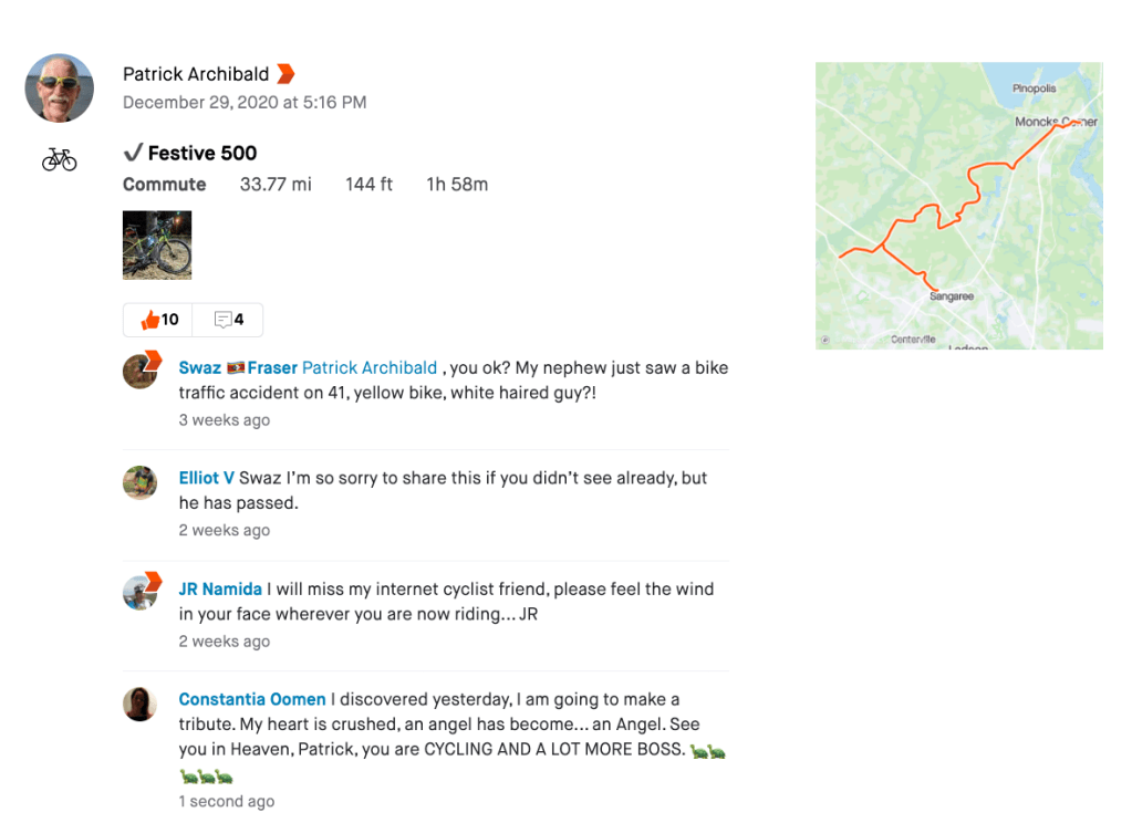 You cycled to and from work, and on the weekends for fun. We gave each other kudos and comments and I felt and still feel that you were and forever will be a very good friend. You don’t even need to have met someone for that. My heart is broken, but I am sure you are now riding your heavenly bike across all the heavens and as one commenter so aptly said, I hope you will always feel the heavenly wind on your face while doing so. We will meet, again, Patrick, see you in Heaven!