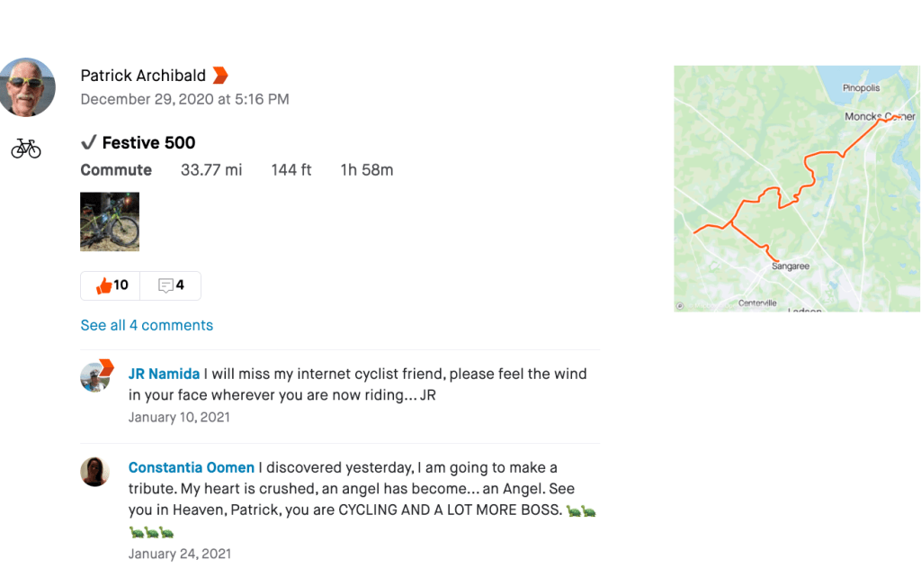 Je fietste voor en naar je werk, en in de weekenden voor je plezier. We gaven elkaar kudos en comments en ik voelde en voel nog steeds dat je een zeer goede vriend was en voor altijd bent. Daarvoor hoef je iemand niet eens ontmoet te hebben. Mijn hart is gebroken, maar ik weet zeker dat jij nu over alle hemelen rijdt met je hemelse fiets en zoals een commenter zo treffend zei: ik hoop dat je daarbij altijd de hemelse wind op je gezicht zult voelen. We will meet, again, Patrick, see you in Heaven!