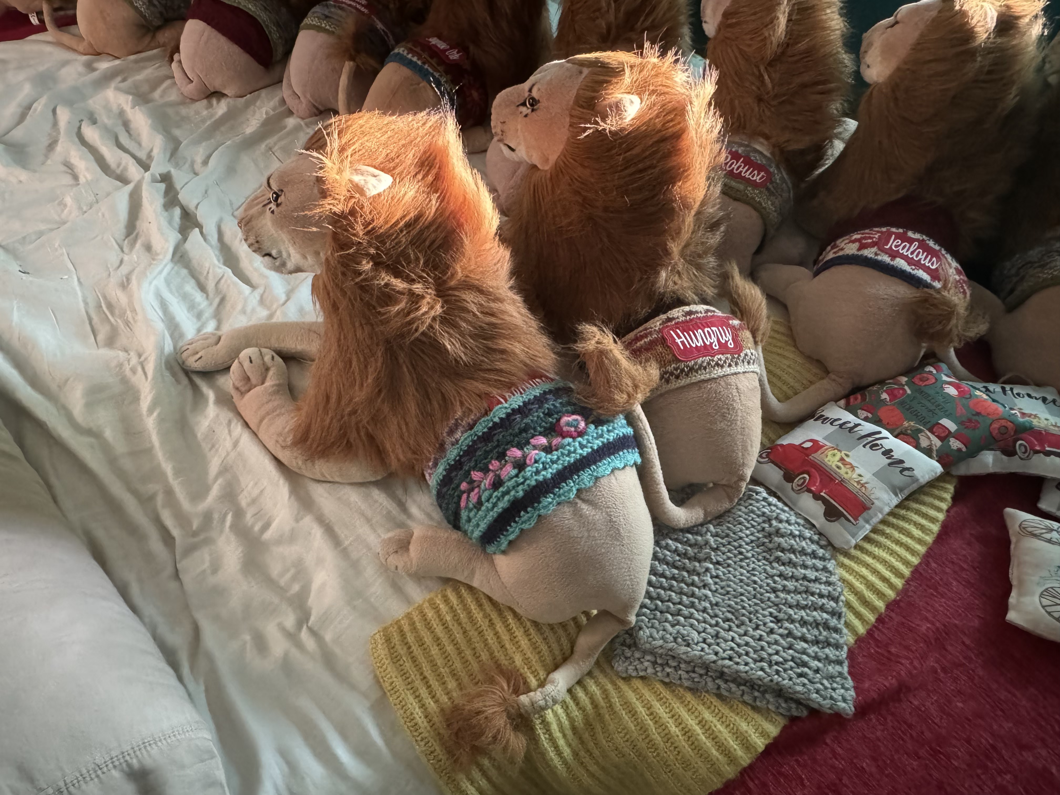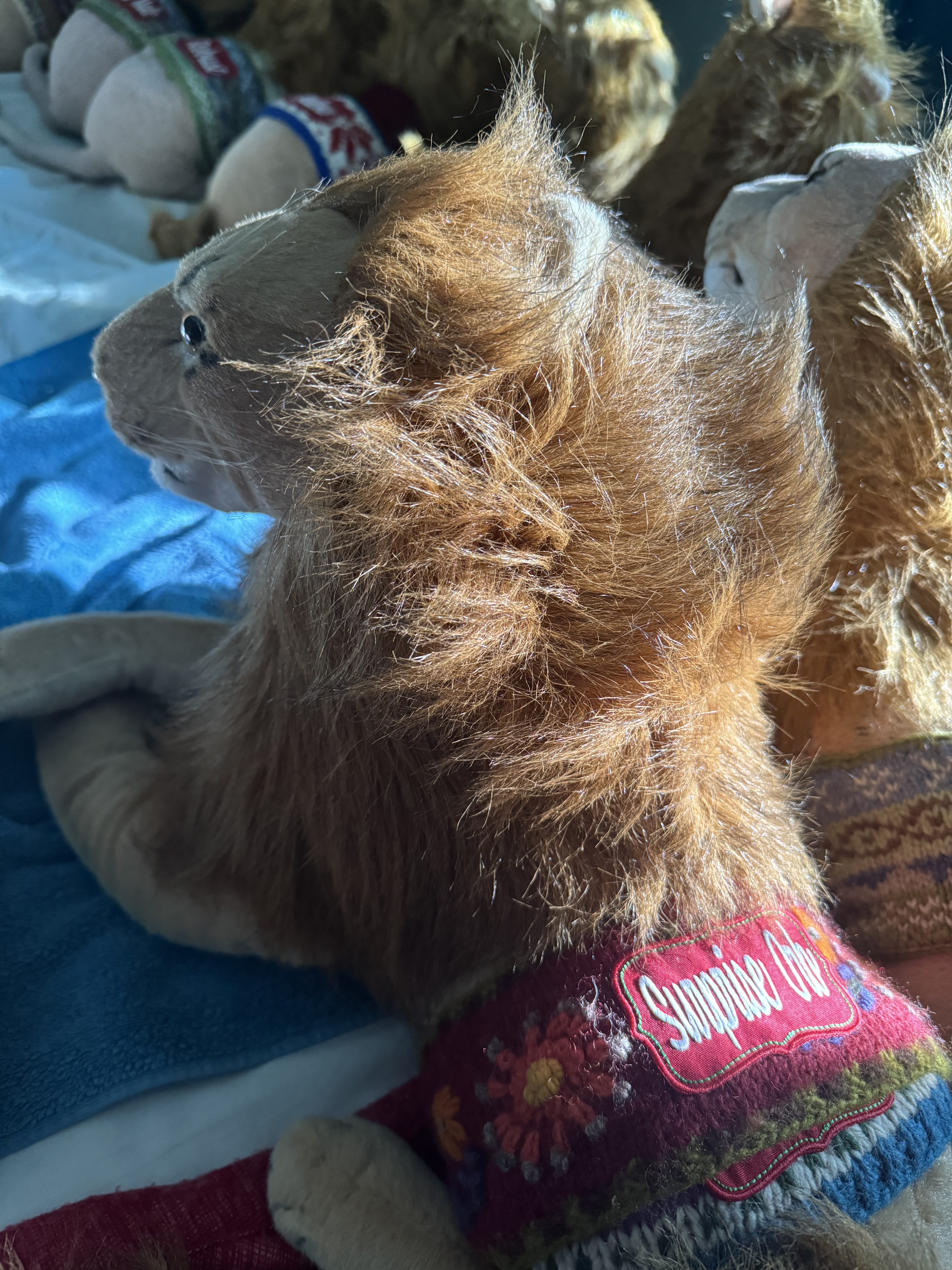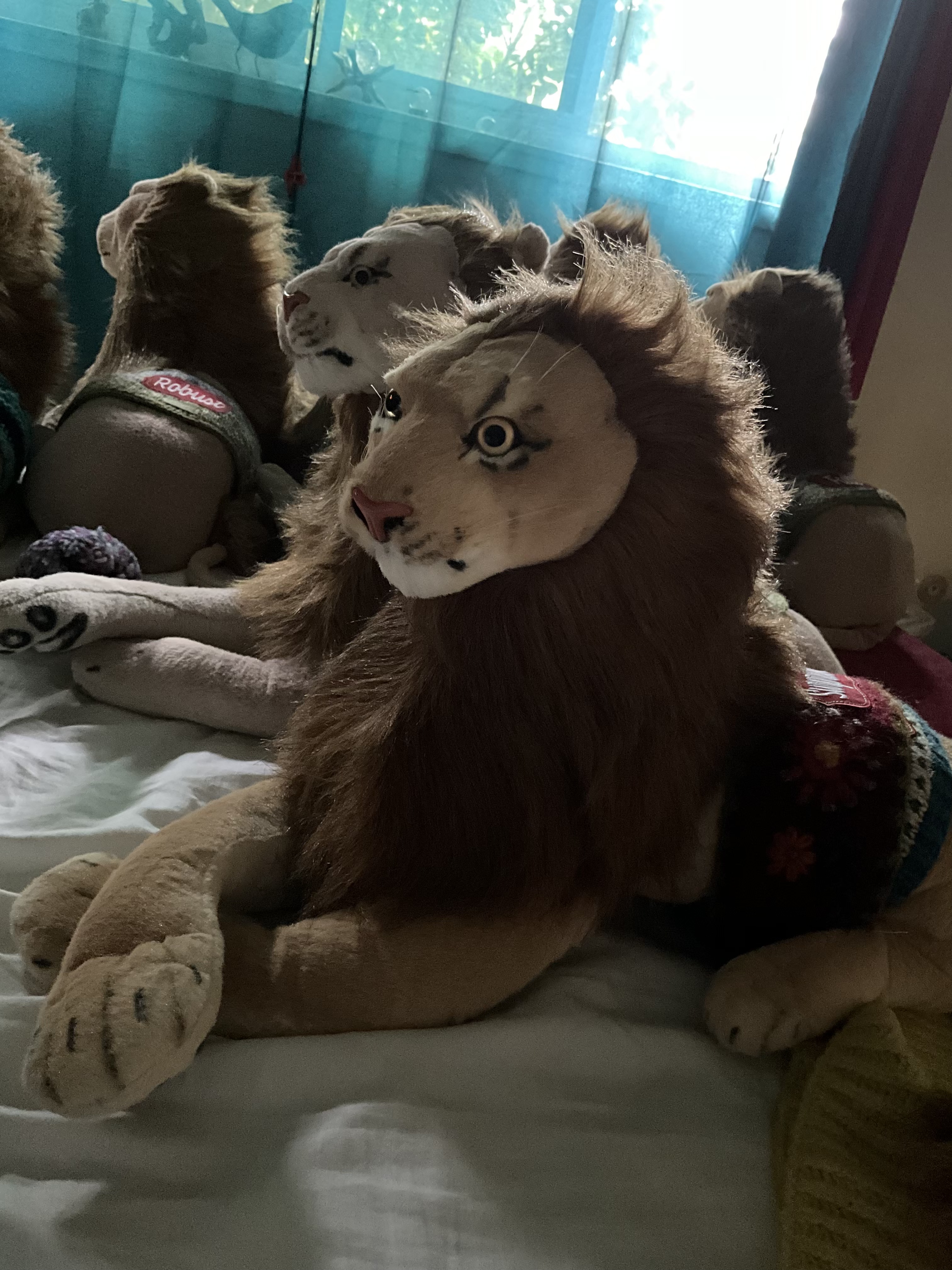 And time and time again, when I was at my wit’s end, the flame beneath my earthly despair and loneliness began to flicker, encouragements came, and still come: “Hang in there!” Let me give a few examples. I’m completely in love with the new inner crew Rob Nanninga lion “Surprise” with his beautiful soft mane, his attentive and lightly ironic, heavenly eyes. I’m head over heels for all the inner crew Rob lions, and the infatuation strikes again and again. And last March, my mind made a beautiful connection: the lion had literally arrived like a ball, and another word for ball is “Orb.” That word is itself a skeptical wink because “orbs” in photos are often seen by paranormal believers as spirits or energies. Suddenly, the word Rob rolled over to Orb, and then I immediately had a new name tag made for Rob Surprise Lion. My mind then continues to play with the name of the new Rob lion: Surprise Orb, Supreme Orb, Sublime Orb, Superb Orb, Super Orb, Stunning Orb…