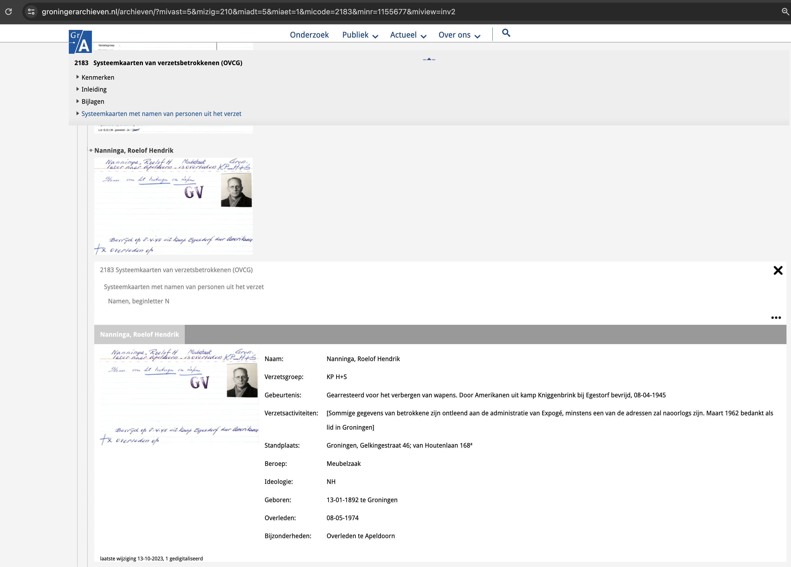 Another morale booster this year was when I Googled the name “Roelof Hendrik Nanninga” once again. And Google said, “Pop!” A new discovery once again highlighted the healthy, skeptical, resistance-offering power of the Nanninga force. Not Rob, but likely a relative of his with the exact same name and location in Groningen, popped up. A Dutch resistance hero who had hidden weapons for the Germans, was subsequently arrested and imprisoned by those same Germans, but fortunately lived to tell the tale when he was liberated by the Americans in 1945! Given the age, he could have been his grandfather or a brother of a grandfather. It seems too coincidental that someone with the exact same name and also located in Groningen was not related to Rob. Such new pieces of information, like when I managed to dig up Rob’s media appearances at the Beeld en Geluid institution, provide fresh fuel for my Rob-flame.